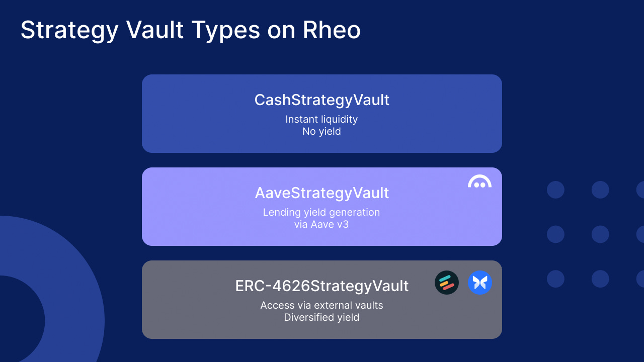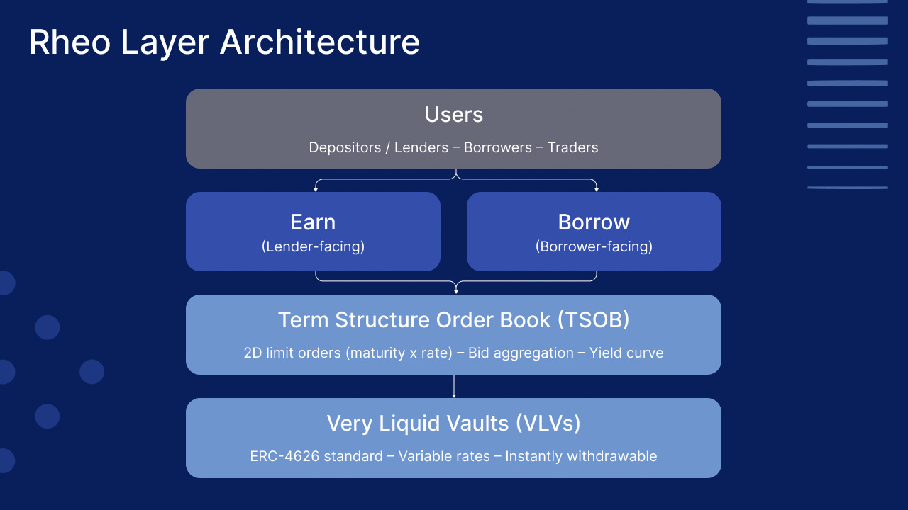 Rheo flips the problem. Instead of locking deposits, it routes them into an ERC-4626 “vault-of-vaults” that allocates across multiple yield strategies – Aave V3 for stablecoin carry, Morpho for optimizer boosts, Euler for balance-sheet flex.